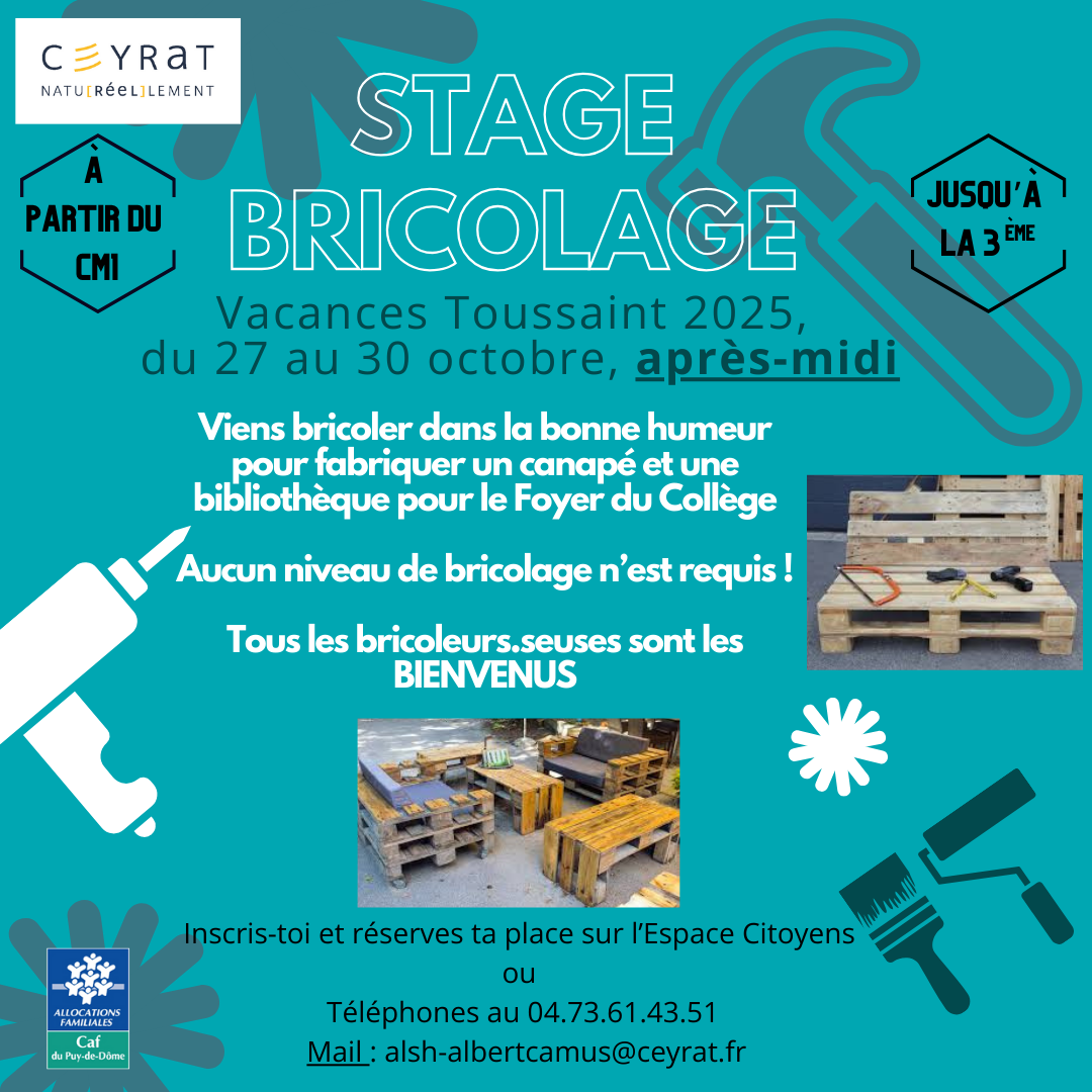 Dans le cadre des activités sportives et culturelles, la commune de Ceyrat organise des stages pour les collégiens pour les vacances d'Automne 2025 : STAGE MULTISPORTS et STAGE BRICOLAGE