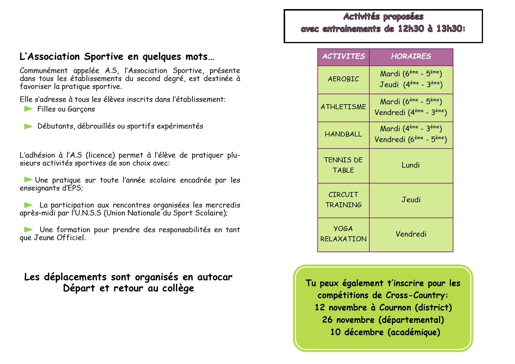 Il est encore temps de s’inscrire auprès des professeurs d’EPS, ou de venir découvrir une activité lors d’une séance d’essai, aux horaires d’entraînement (voir le planning ci-joint).
