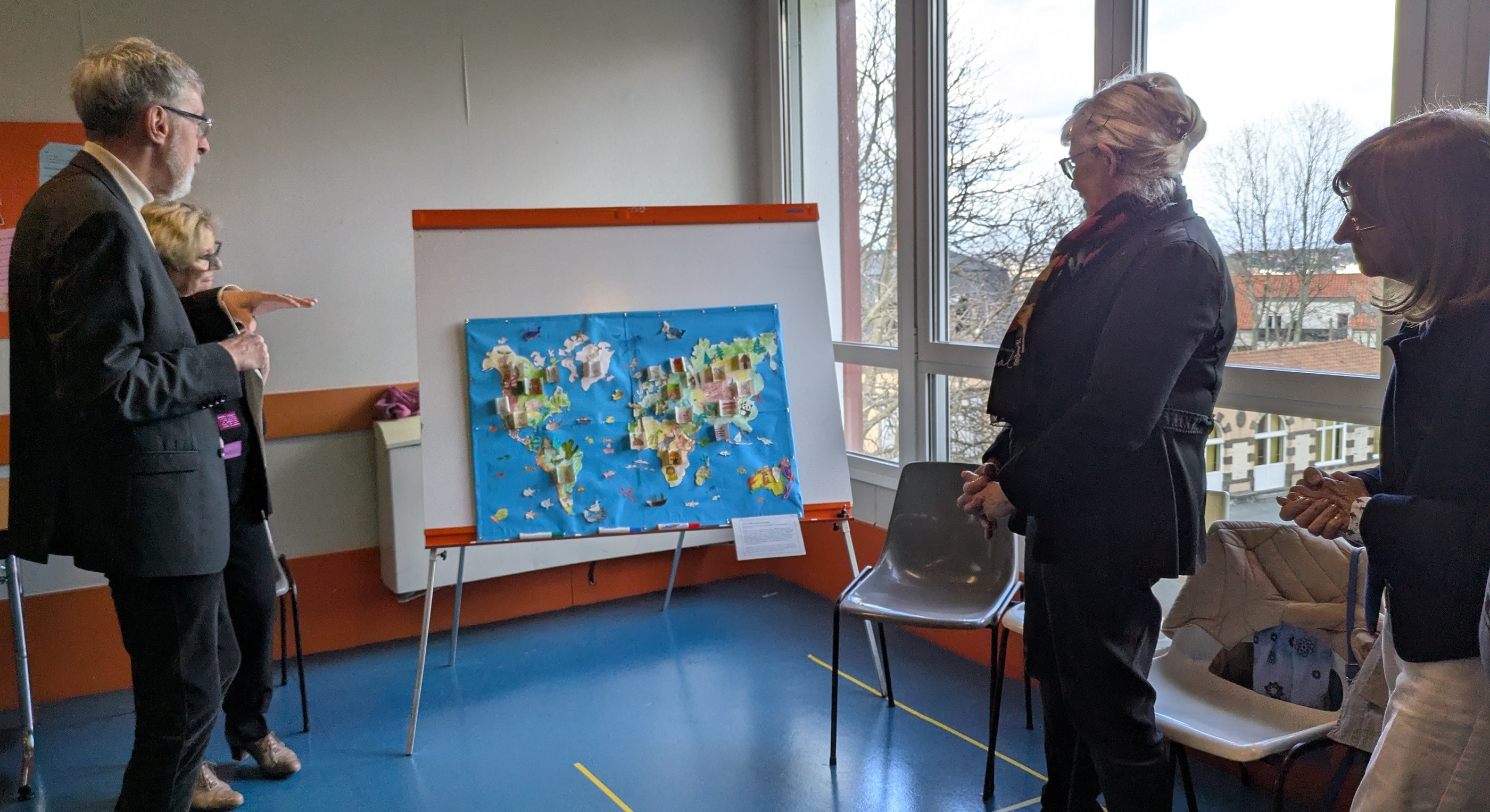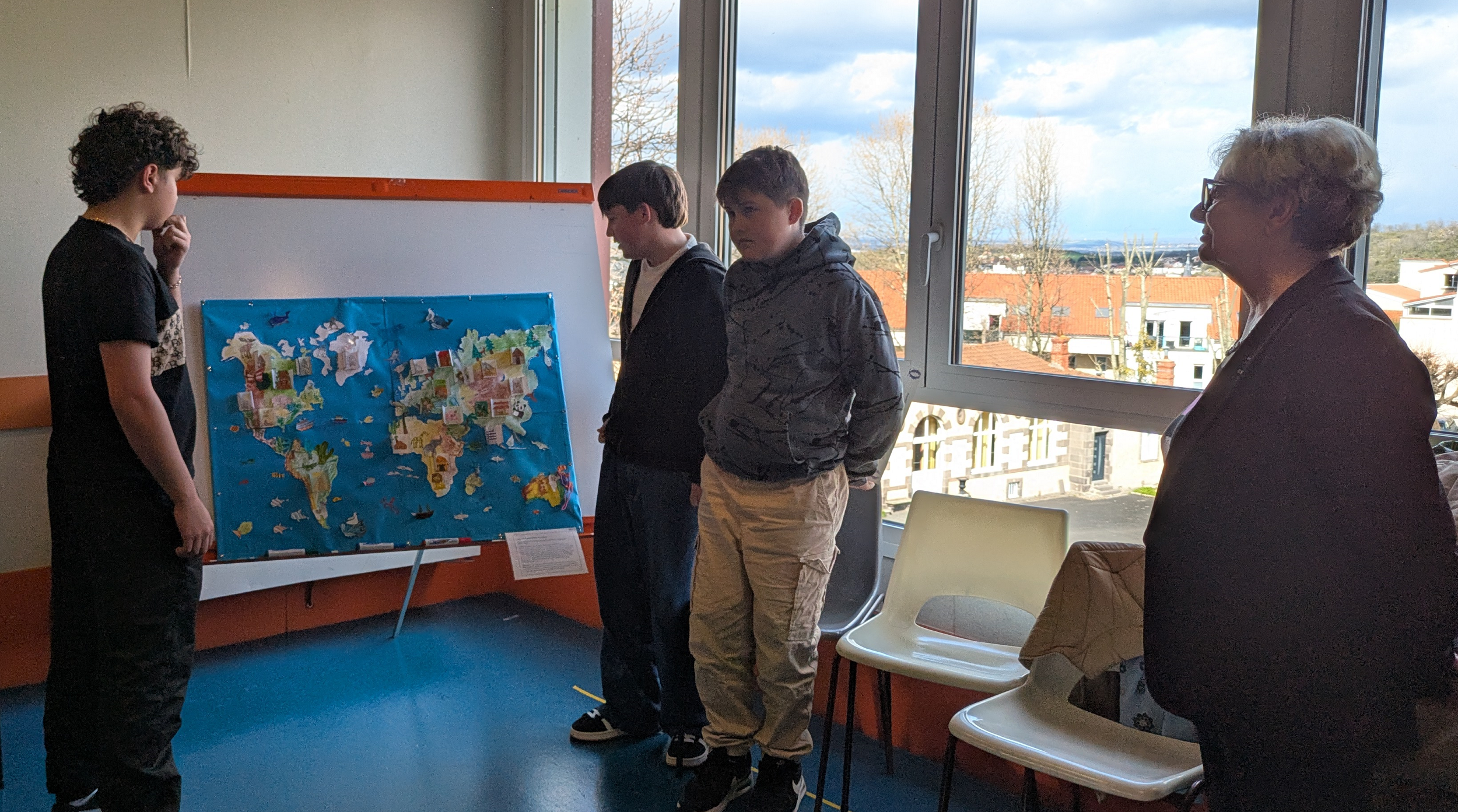 De leur côté, les élèves du dispositif ULIS du collège Henri Pourrat ont travaillé collectivement en réalisant un planisphère illustrant les habitats des animaux et des humains dans les différents continents et océans.
